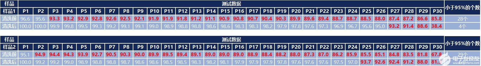测试数据:每个样品随机取30个点(测量点为直径1mm)测试,以95%为清洁度临界值(不影响母线电镀质量),统计小于95%点个数