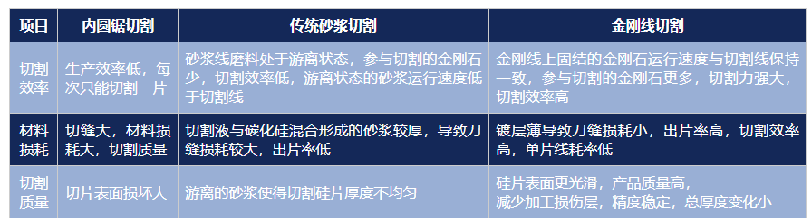 传统切割硅片的工艺主要有内圆锯切割和传统砂浆切割法,随着金刚线切割技术的兴起,金刚线切割迅速取代了传统的砂浆切割技术,成为切割硅片的主流。